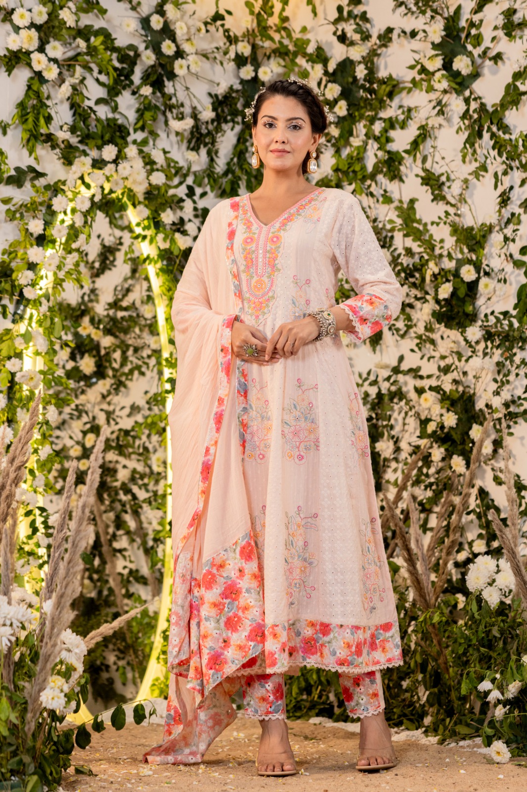 Beautiful Three Piece Cotton Schiffili Full Flair Anarkali Kurti With Daman Digital Print & Embroidery On Yoke, Sleeves, Hemline & All Over Kurti Paired With Malmal Cotton Pant With Schiffili Embroidery Work & Printed Malmal Dupatta With Border