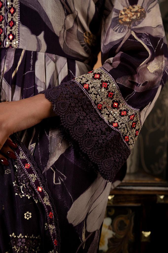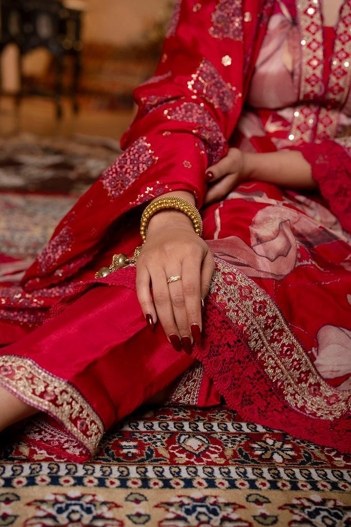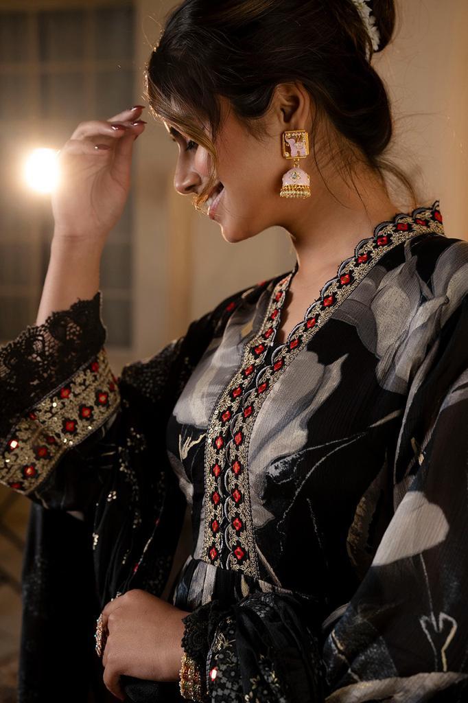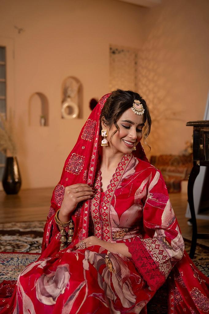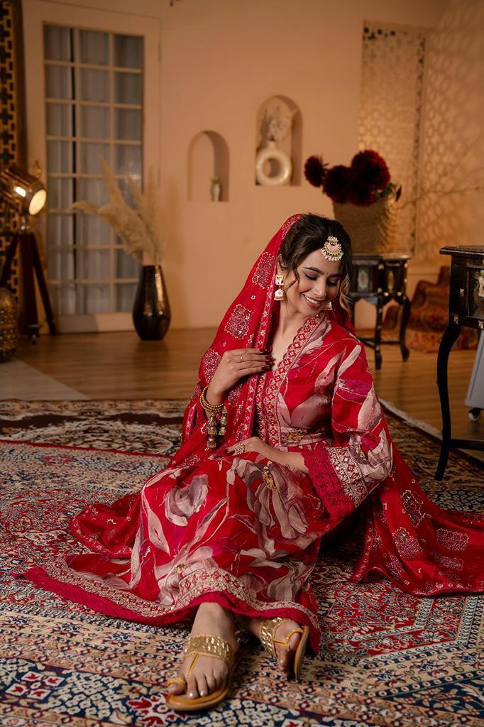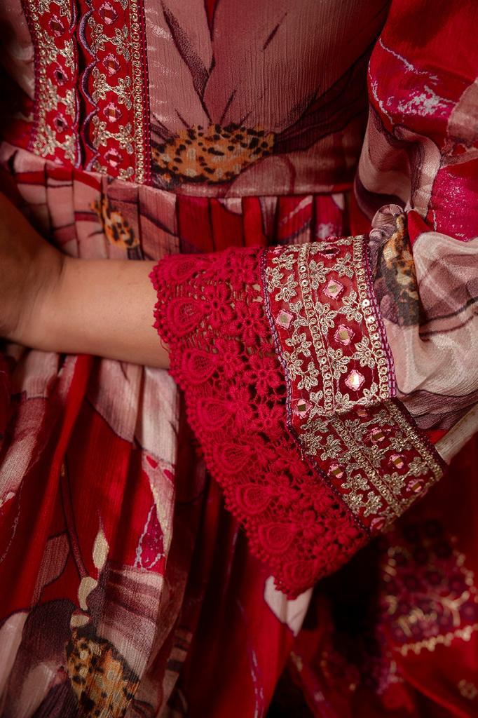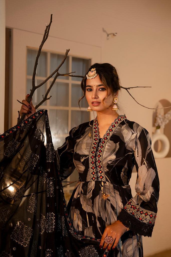 Beautiful Digital Designer Floral Print Pure Chinnon Full Flair Nyra Kurti Set With Embroidery on Yoke Paired With Pant With Embroidery And Pure Chinon Dupatta With Embroidery & Border