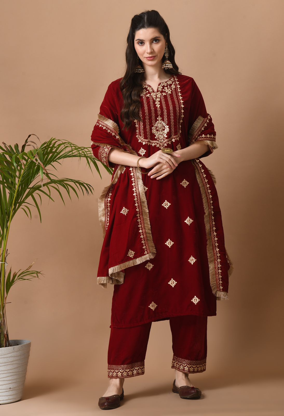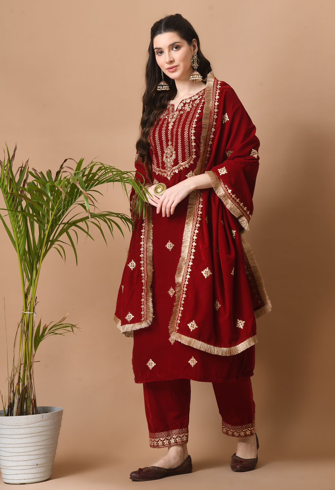Beautiful Heavy Velvet Suit With Embroidery All Over And Heavy Velvet Dupatta with Punjabi Lace And Pants