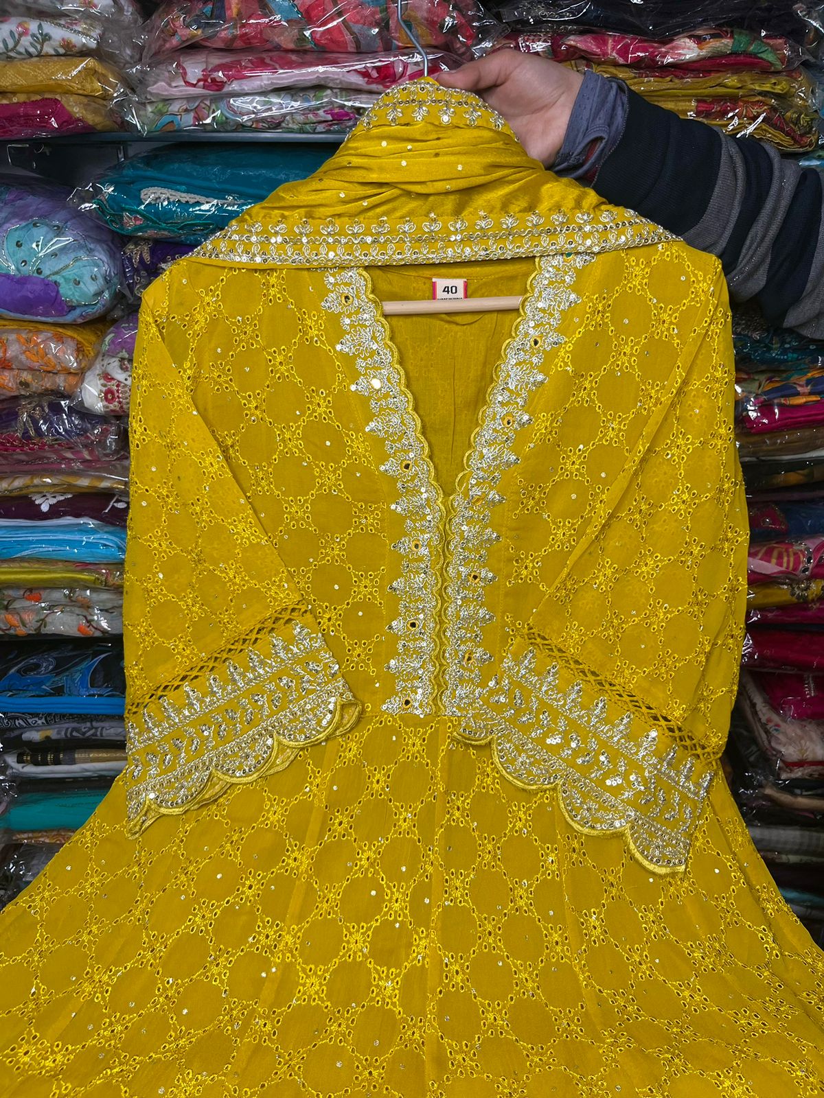 Beautiful Designer Three Piece Georgette Schiffili Anarkali Kurti With Embroidery & Frill All Over Kurti And Hemline Paired With Pant And Pure Dupatta With Beautiful Embroidery