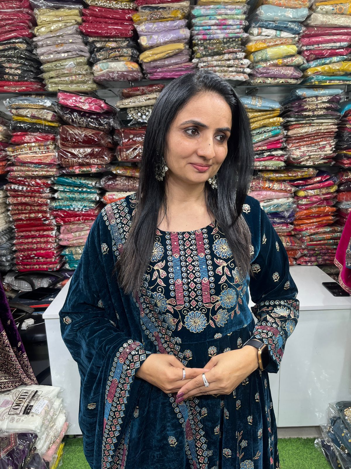 Designer Velvet Teal Blue Anarkali Set