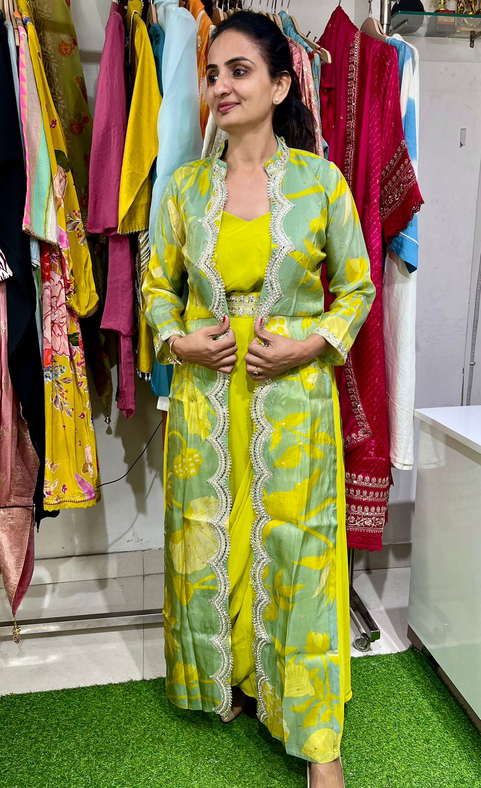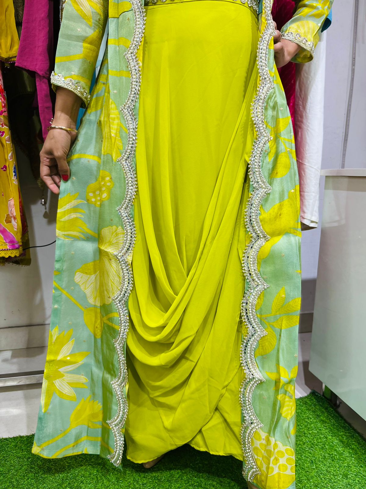 Premium Pure Georgette Cowl Dress with detachable handwork belt with Pure Crape digital shrug with embroidery.