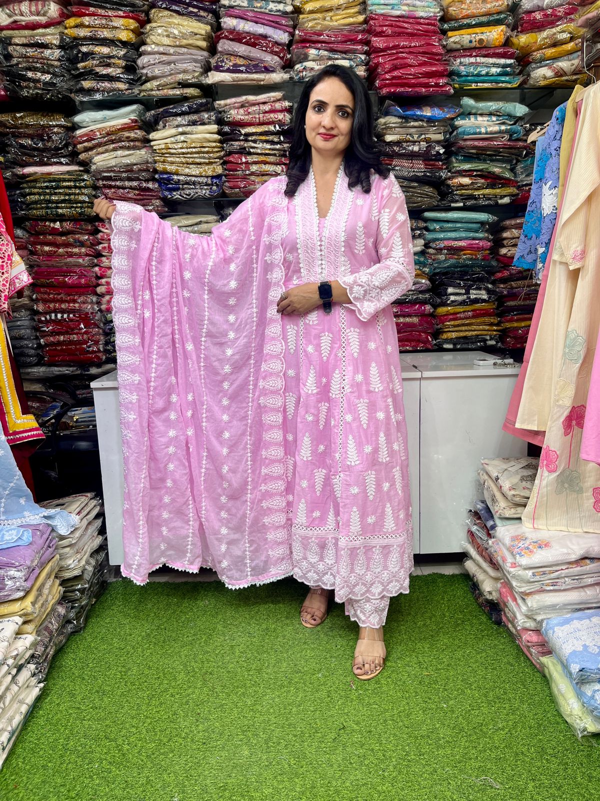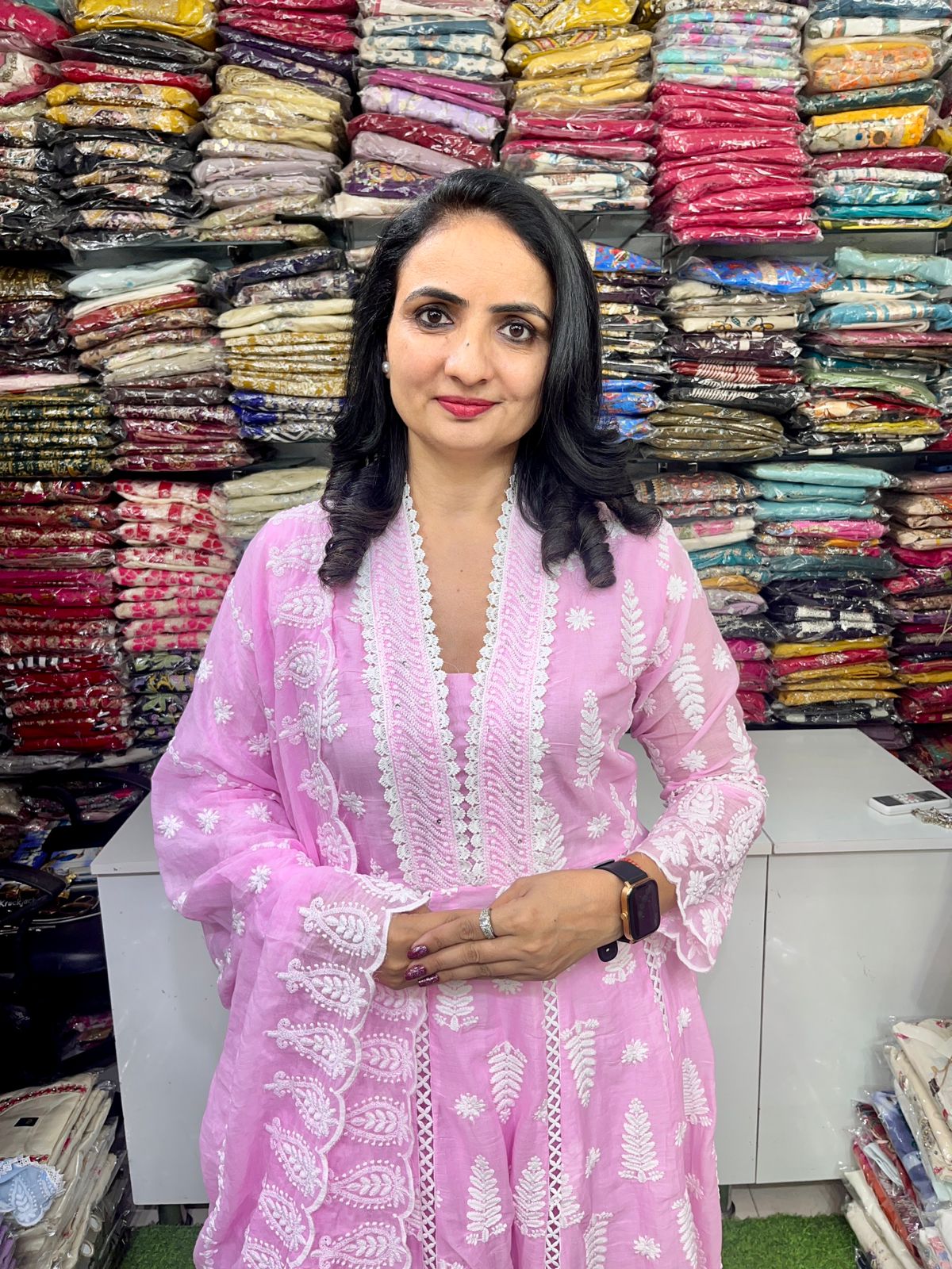 Pure Mal Cotton Chikankari Pink Anarkali Set